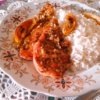 Egy lábosban kókuszsíron megpirítjuk az apróra vágott vöröshagymát, hozzáadjuk a paprikát, friss paradicsomot, ezt követően, hozzáadjuk az átnyomott fokhagymát, a felvágott chilit, és összepirítjuk.