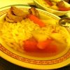 Kínálhatunk mellé külön leves lében kifőzött csigatésztát, vagy forrázott rizstésztát. Én, hogy ne pocsékoljam az értékes húsleves levét, egy húsleveskocka és forró víz kíséretében főzőm ki külön a csigatésztát.