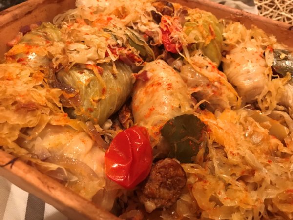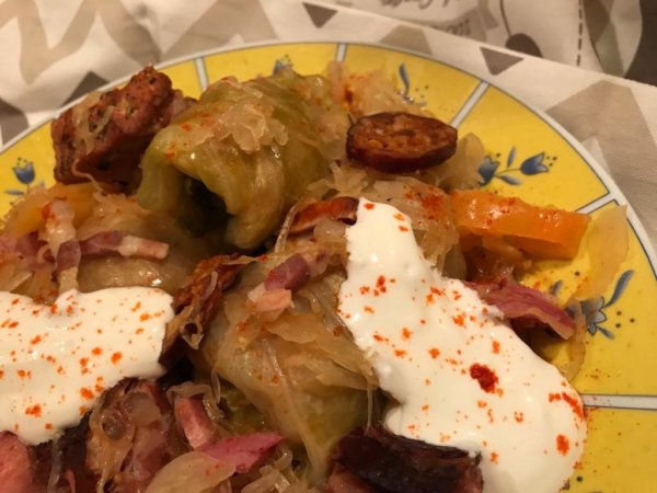 Ha elkészültünk, tegyük rá a betekert töltött káposztát, a karikára vágott kolbászt, és a csíkokra vágott füstölt szalonnát. Majd tegyük rá a karikára vágott lila hagymát, a félbevágott, vagy szeletelt paradicsomot. És akkor még jöhet egy-két fűszer: babérlevél, szórjuk meg egész ötborssal, pici kakukkfűvel, kaporral, Kalocsai pirospaprikával és chili pehellyel, 2-3 karika zöld csípős paprikával, de ez elhagyható, helyette paprikát vágjunk fel szeletekre. A tetejére apró káposzta kerüljön.
