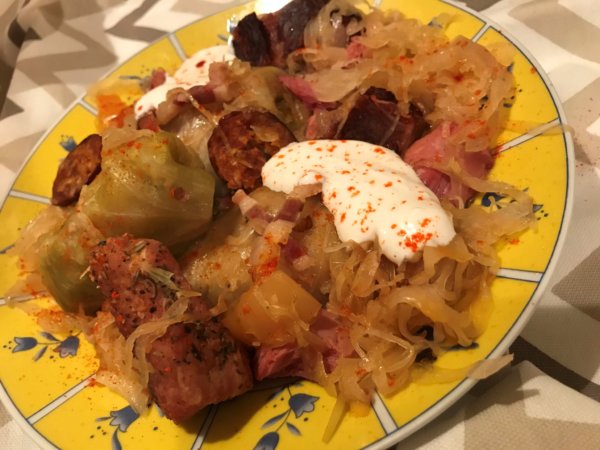 Ha füstölt csülök és oldalas főző levéből 3-4 merőkanálnyit – az íze miatt – öntsünk a káposztára, és a többit vízzel, pótoljuk összesen annyival, hogy épp hogy ellepje. Tegyük fel főni nagyon lassú fokozaton kb. 1 max. 2 óra mivel a húsok nagy részét már előfőztük, elősütöttük. Időnként ellenőrizni kell, hogy a vizet pótolni kell vagy sem.