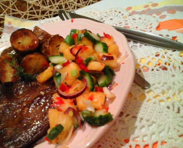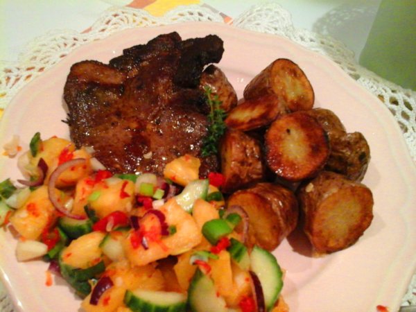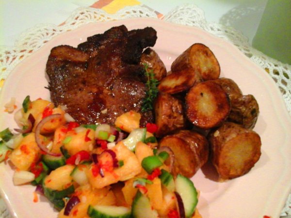 Ezt követően süssük meg a szeletelt kakukkfüves sült tarját. Majd tálalásnál halmozzuk mellé az ananász salsát, és a sült burgonyát.