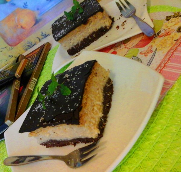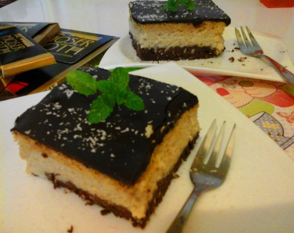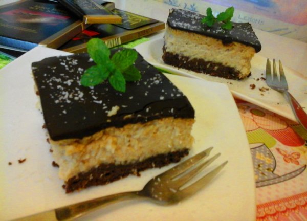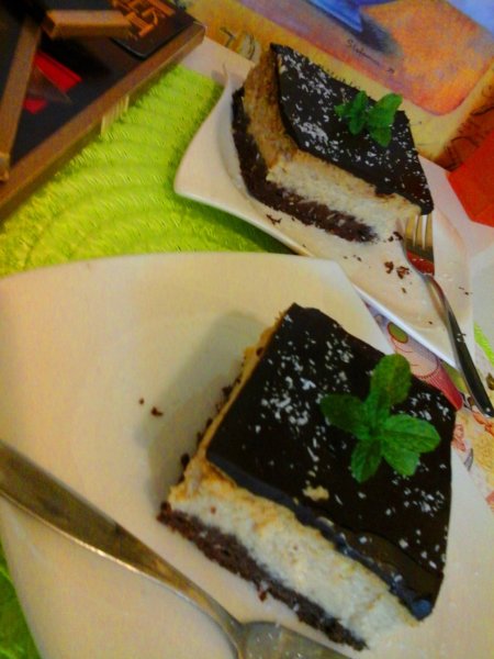 Ha a csoki megdermedt a tetején, szeletelve tálaljuk. Mentával és kókuszreszelékkel díszítjük.