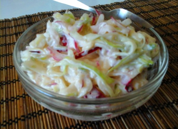 A káposztasaláta hozzávalóit, vékony csíkokra vágjuk. Rászórjuk a cukrot, sót, ecetet, citrom levét és összekeverjük, legalább egy órát állni hagyjuk a hűtőben. Készítsük el a saláta öntetet, a tejfölt kikeverjük a citrom levével, cukorral, mustárral. A lehűlt és kinyomkodott salátát összekeverjük az öntettel és legalább fél órára hűtőben hagyjuk, hogy összeérjen.