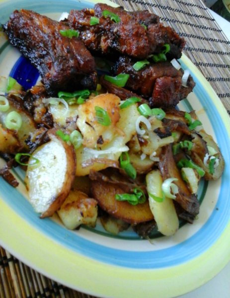 Készen is vagyunk mindennel, már csak a tálalás marad. Egy tányérra halmozzuk rá a krumplit, mellé tálaljuk a ragadós sült oldalast, szórjuk meg apróra vágott zöldhagymát, és kínáljuk hozzá a káposztasalátát. De akár krumpli elhagyásával, csak káposztasalátával is fogyaszthatjuk.
