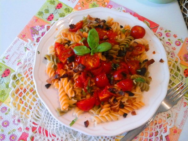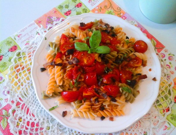 Majd a leöntött füstölt szalonna zsírját, keverjük el a tésztával. Ezt követően, adjuk a tésztát, a paradicsomhoz egy gyors keverés, szórjuk meg a pirított füstölt szalonnával, szórjuk meg durvára vágott bazsalikommal és már ehetjük is.