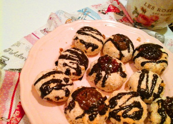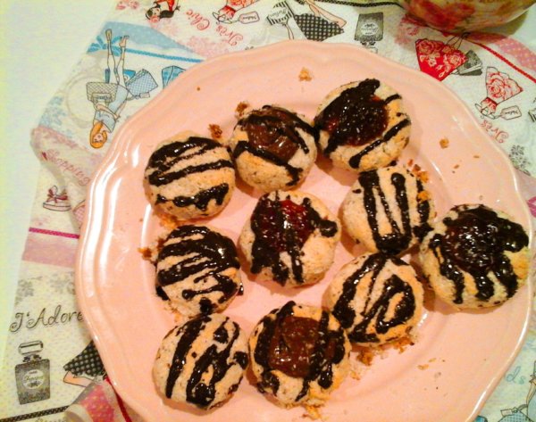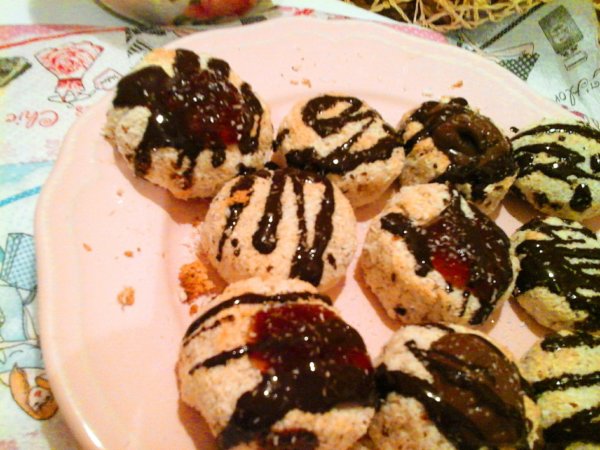 Ha kihűlt a kókuszos teasütemény, akkor egy kis kanál segítségével, megtölthetjük őket, eperlekvárral, nutellával vagy mirelit málnával.