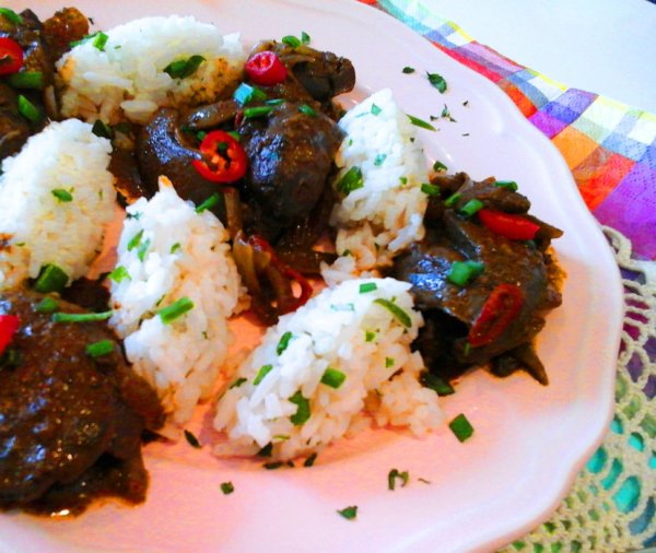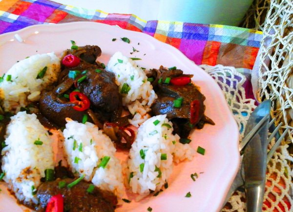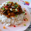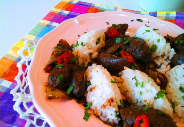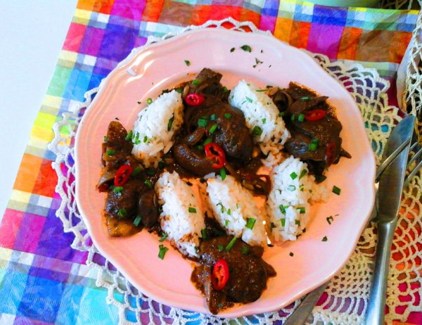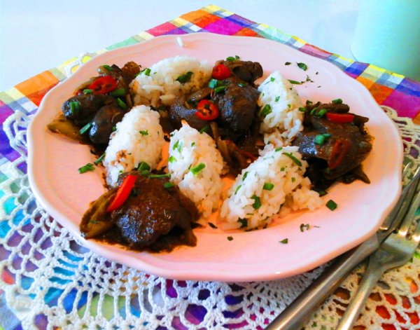 Vörösboros pirított csirkemáj/zöldhagymás rizzsel
