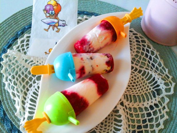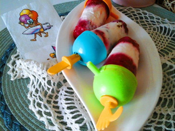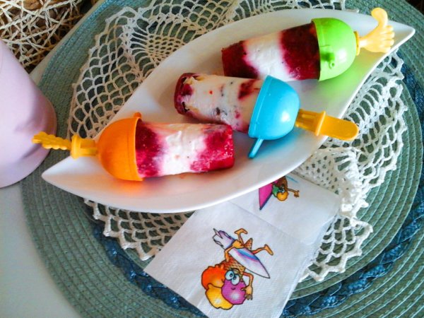 Ha elkészültünk, vegyük elő a jégkrém formákat, kanalazzunk az aljára eper pürét, majd a görög joghurtot és ismét eper pürét és joghurtot…