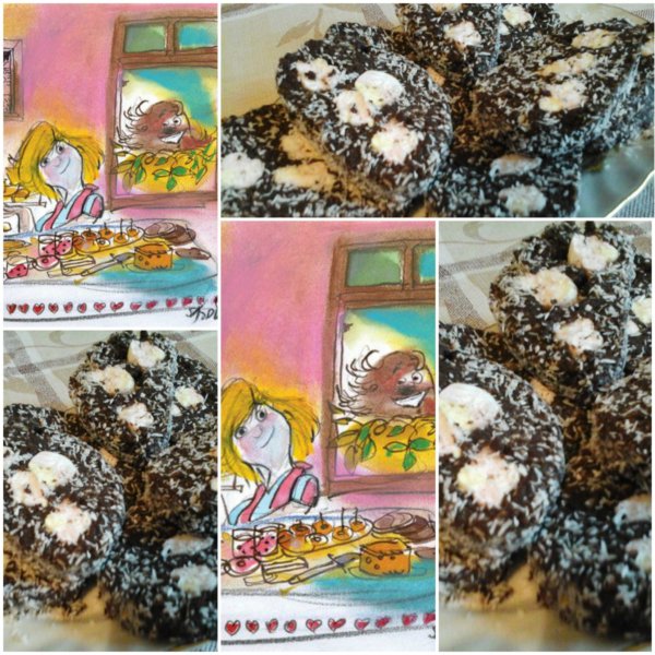 Egy darab sütőpapírt megszórunk kókuszreszelékkel, majd ezen kinyújtjuk a kakaós kekszes masszát, és bele, vagyis rátesszük sorba a pille cukrot és óvatosan feltekerjük, (mint a bejglit). Majd hűtőbe tesszük kínálásig. Utána lehet szeletelni.