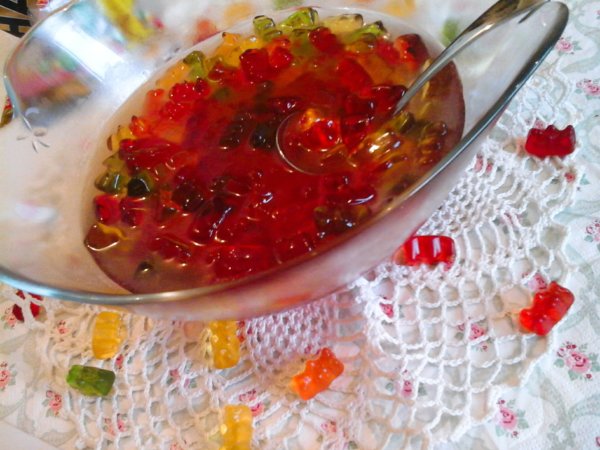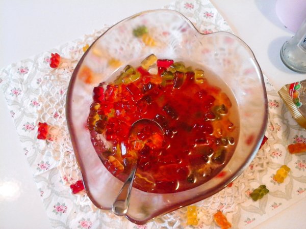 Miután másnap kivettük a hűtőből láthatjuk, hogy a gumicukrok megdagadtak, és teljesen magukba szívták az italt.