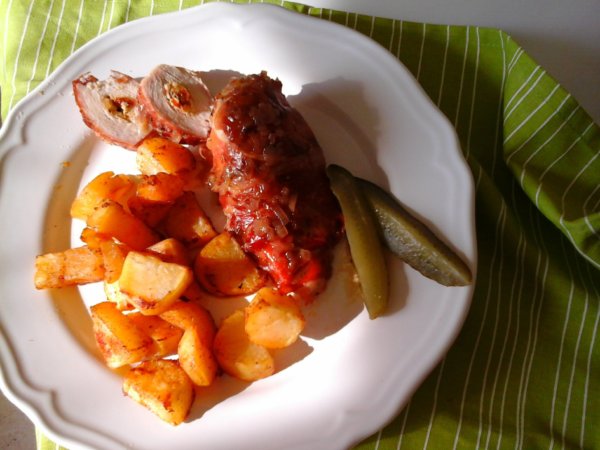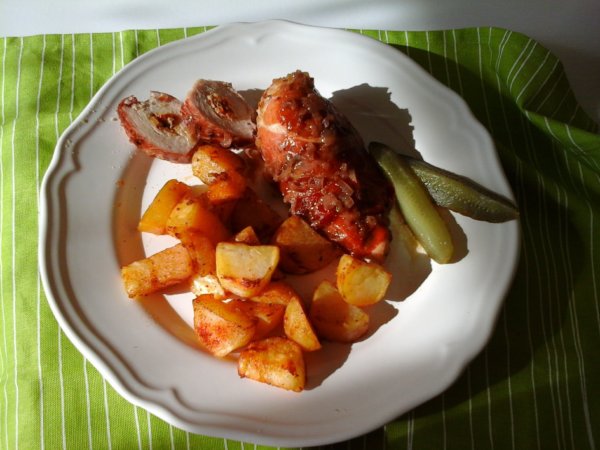 Visszatérve a recepthez, amikor mindennel elkészültünk, tálalhatjuk a zsályás túrókrémmel töltött és serrano sonkába göngyölt sült csirkemellet, a rongyos sült burgonyával és kovászos uborkát is kínálhatunk hozzá. De akár saláta is lehet a köret a csirkemellhez. Ki ahogyan szeretné… 🙂