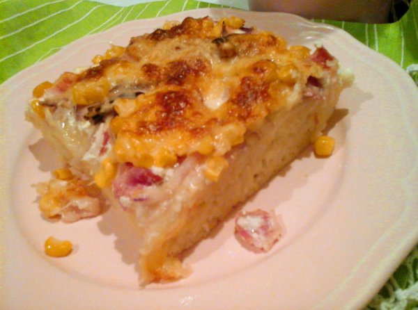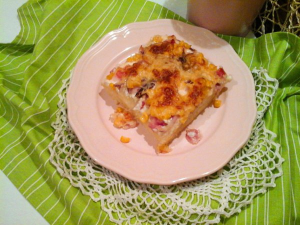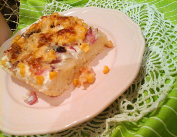 Ezután vegyük ki a tésztát, vigyázva meg ne égessük magunkat a forró tepsivel. Majd kenjük meg a tésztát a fokhagymás tejföllel, szórjuk rá a bacon csíkokat, a szeletelt lila hagymát, szórjuk meg kukoricával, majd a mozzarella és végül a gouda sajtot is tegyük rá.