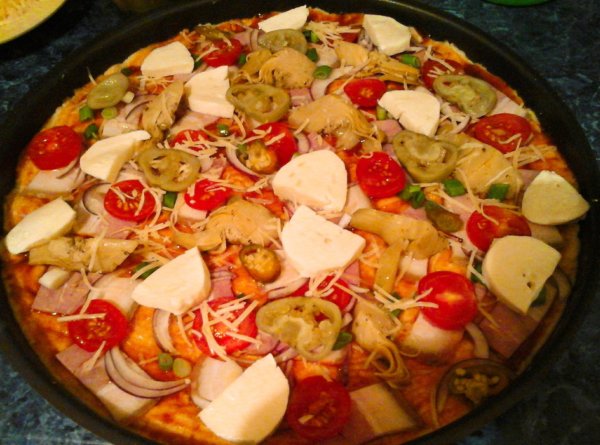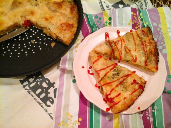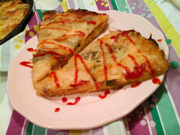 Ezután kenjük meg kethcuppal, és a pizza feltéteket pakoljuk rá, a legvégén a reszelt gouda sajtot, és a mozzarella sajtot. De persze bármi lehet a feltét, amit szeretünk. Ezután tegyük a 200 fokra előmelegített sütőbe, annak is a legaljára, a rácsra, kb. 15-25 perc alatt megsül a pizza.