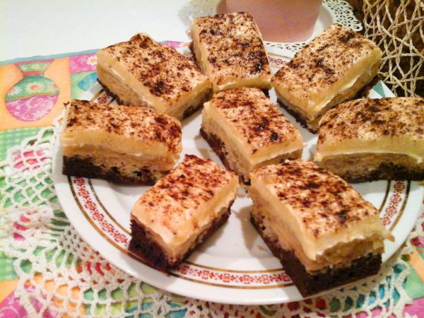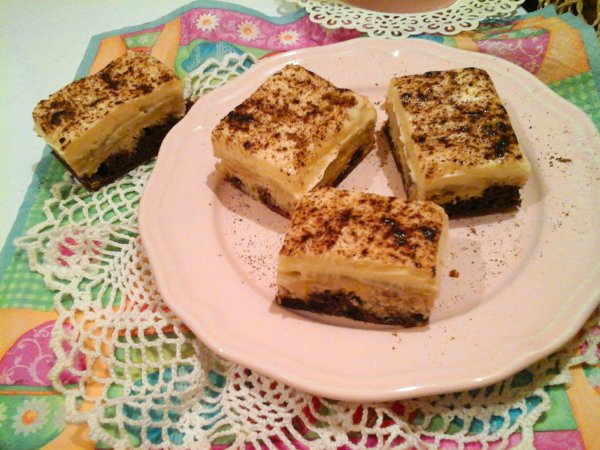 Ezt követően, a sárga tészta masszát, öntsük rá az almákra, egyengessük el, ezután jöhet rá a kakaós tészta massza, majd egyengessük el óvatosan, és egy fanyárssal, keverjük össze, a fehér és a kakaós masszát, olyan mintázatot kreáljunk bele, úgy, ahogyan tetszik. 🙂