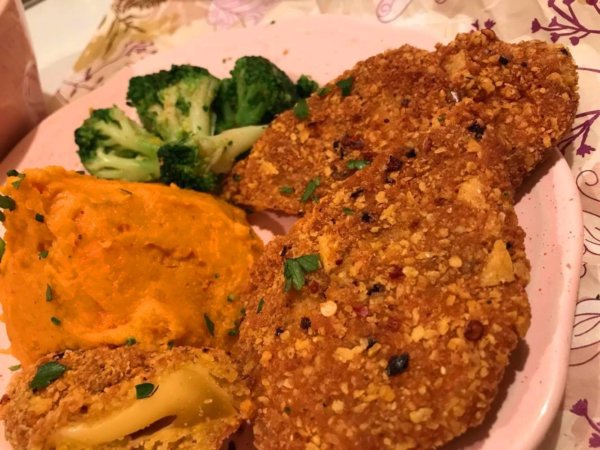 Ropogós sajtos rántott hús, rozmaringos tejszínes burgonyapürével és salátával