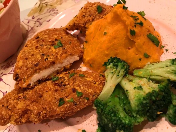 Kínáljunk hozzá, blansirozott brokkolit, édesburgonya pürét és vegyes savanyúságot.