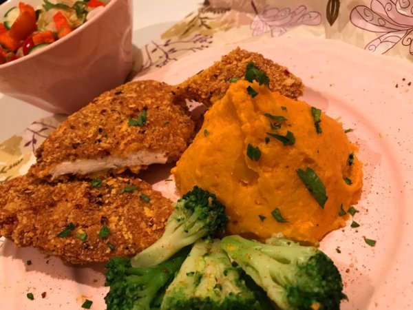 (édesburgonya pürével, brokkolival és vegyes savanyúsággal)