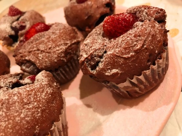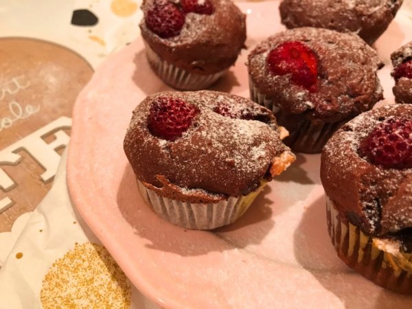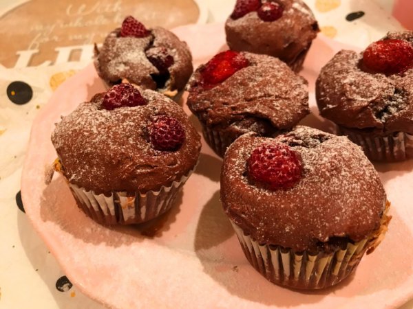 Nyáron lefagyasztottam epret, málnát, ribizlit, áfonyát stb… és most úgy megkívántam az epret, ja és a málnát is már hetek óta, hogy gondoltam egy nagyot és sütöttem egy kis csokis-nutellás muffint, melyet megkoronáztam a finom gyümölcsökkel.