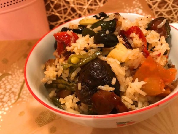 Amikor elkészült, akkor keverjük össze a kifőzött jázmin rizzsel, és már is falatozhatjuk ezt a finom, mediterrán zöldséges rizst.