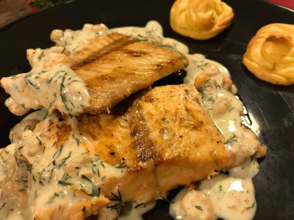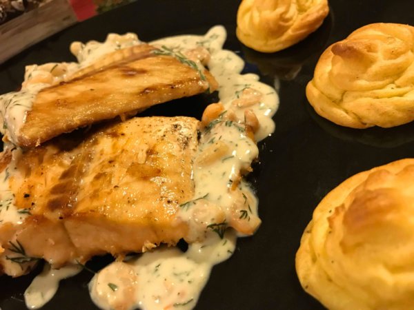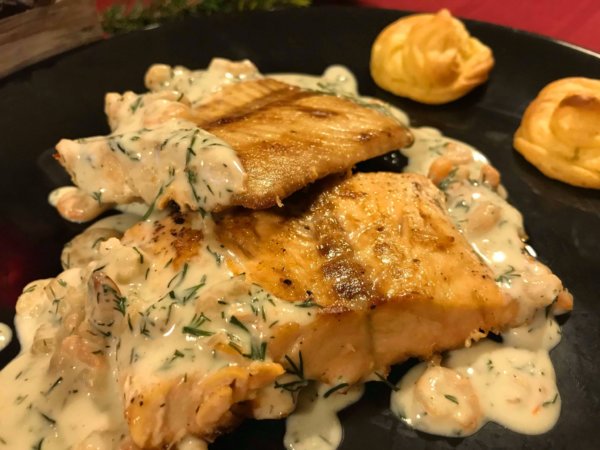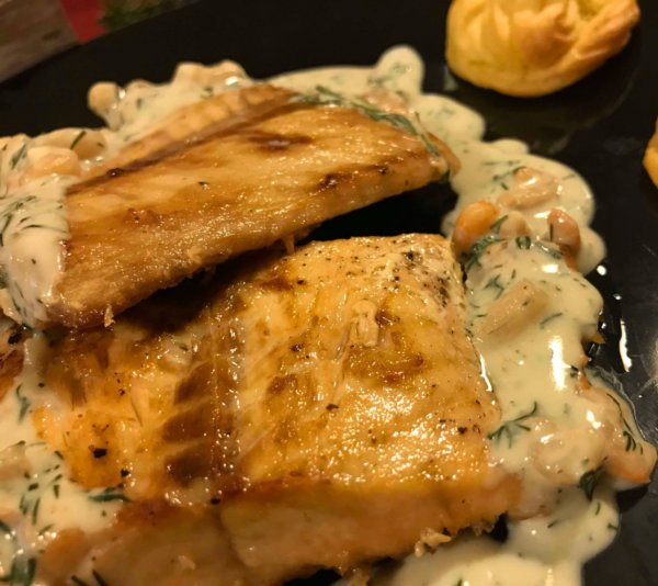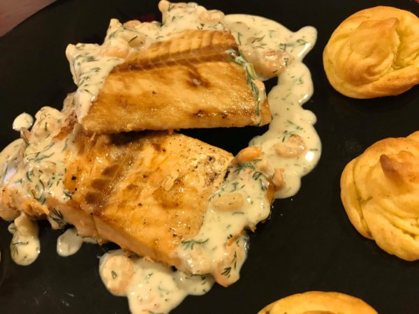 Tálaláskor helyezzük tányérra a lazacszeletet, öntsük nyakon a tejszínes-kapormártással, majd tegyünk mellé a hercegnőburgonyát, és így kínáljuk kedves családunknak ezt a kapormártásos lazacszeleteket.