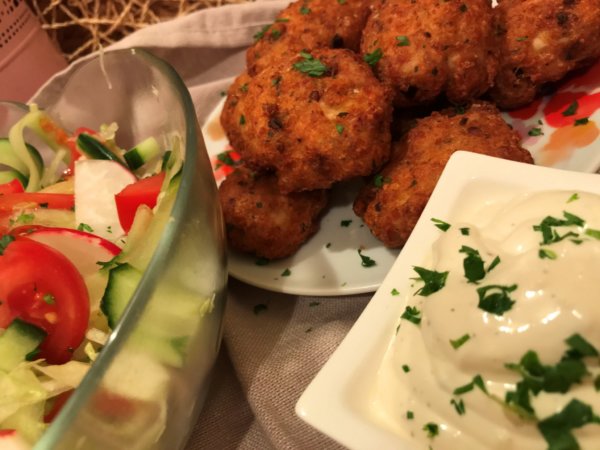 Ha készen lettünk, csak mártogatóssal, vagy mint én salátával kínáljuk meglocsolva a fokhagymás ajoli szósszal.