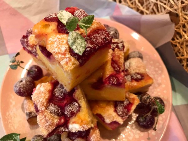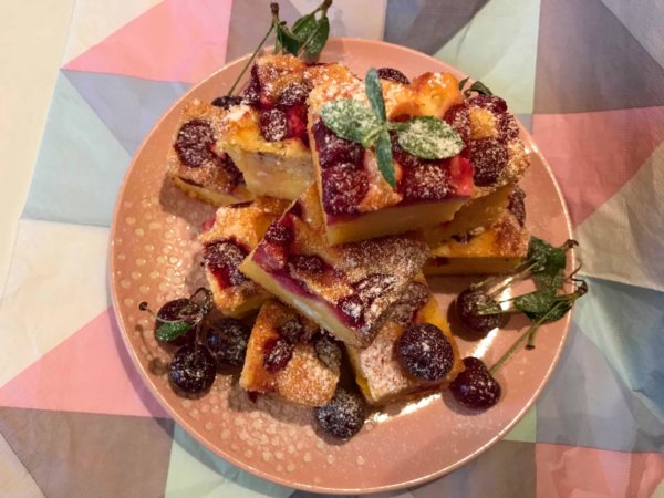 Hagyjuk a tepsiben kihűlni, tálaláskor porcukorral meghintve, mentával és friss meggyel kínáljuk.