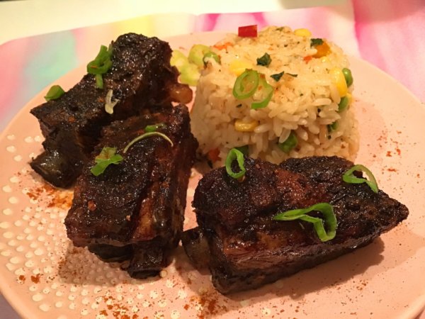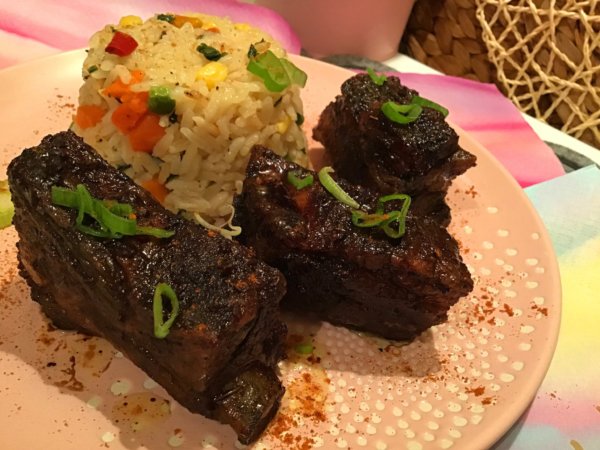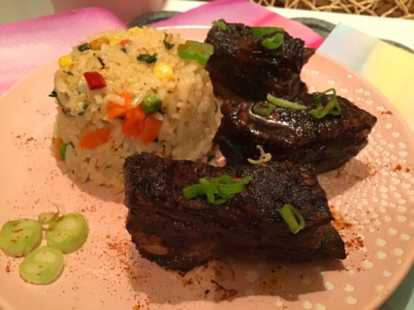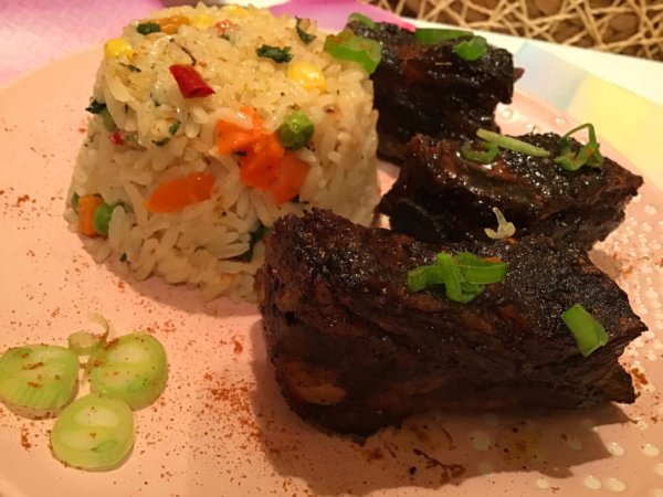 Mázas sült oldalas, színes rizibizivel