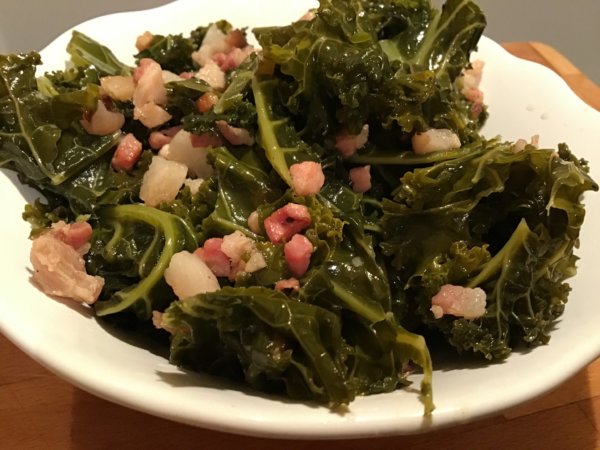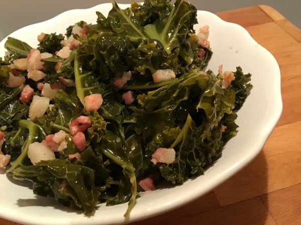 Majd ezután tegyük a pirított szalonnára a fodros kelt, adjuk hozzá a szódabikarbonát, (így szép zöld marad a kel, illetve nem is fog fájni a gyomrunk a káposztától). Majd borsozzuk, majd egy löttyintésnyi fehérborecetet, vagy almaborecetet tegyünk bele, keverjük el. Fedjük le és főzzük puhára.