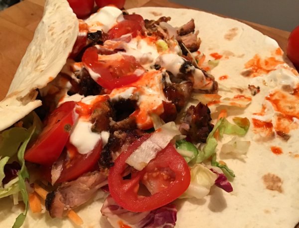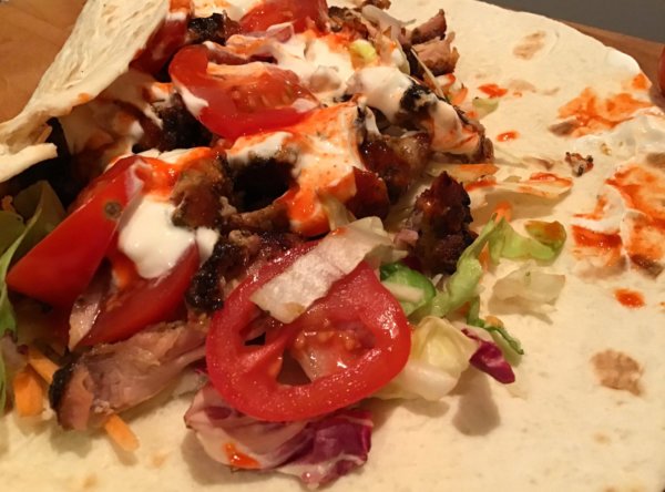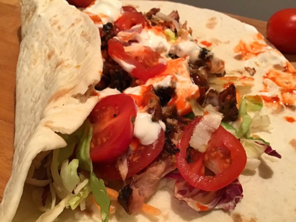 Ha mindennel elkészültünk, akkor állítsuk össze a házi shawarma finomságunkat: A tortilla lapot kenjük meg fokhagymás joghurttal/tegyük rá a megsült shawarma csirkecombfilét/ vegyes saláta mixet/paradicsomot/ecetes káposztasalátát/locsoljuk meg megint fokhagymás joghurttal/és sriracha szósszal. Kínáljunk mellé ropogós sült krumplit, és máris falatozhatjuk ezt a finomságot.