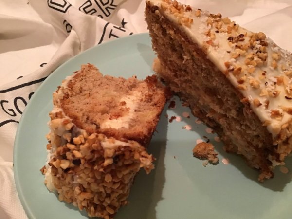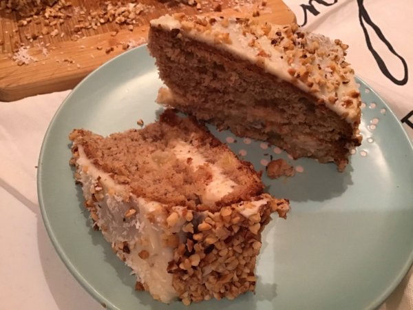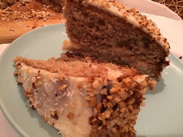 Ha megsült az ananászos-banán tortánk, hagyjuk kihűlni. Amíg hűl, keverjük össze a szobahőmérsékletű mascarponét a porcukorral, és ízesítsük vanília aromával. Majd a kihűlt tortát vágjuk ketté, kenjük meg, majd az oldalát és a tetejét is. Majd szórjuk meg durvára vágott mogyoróval.