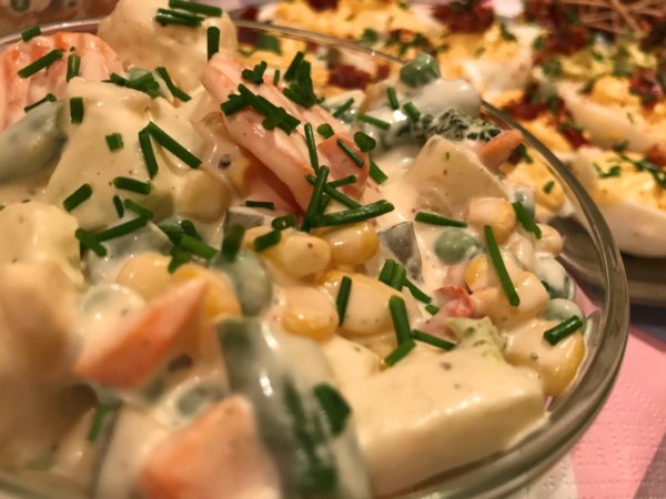 Kísérőként készíthetünk franciasalátát is hozzá, a maradék majonézes öntethez, adjunk mirelit zöldséget, apróra vágott ecetes uborkát, almát és jó l keverjük el. Ha kevés az öntet, duplázzunk, ha francia salátát is szeretnénk hozzá.