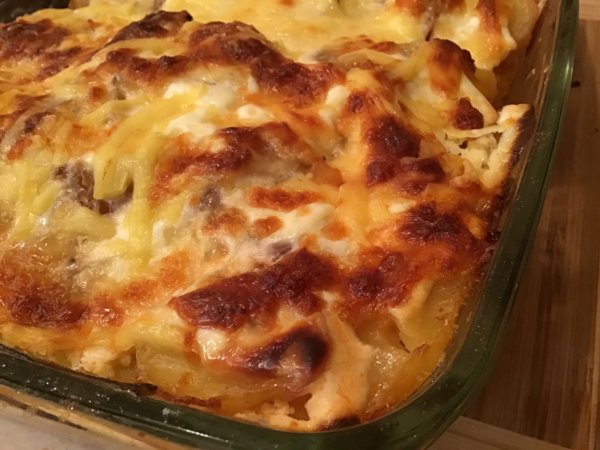 Majd ismételjük meg a rétegezést, amíg el nem fogynak az alapanyagok, krumpli… stb. és a legtetejére megint krumpli, majd tejfölt kenjük rá, és szórjuk meg zöldhagymával, baconnal és cheddar, mozzarella sajttal. Majd öntsük nyakon az olvasztott vajjal, vagy kókuszolajjal.