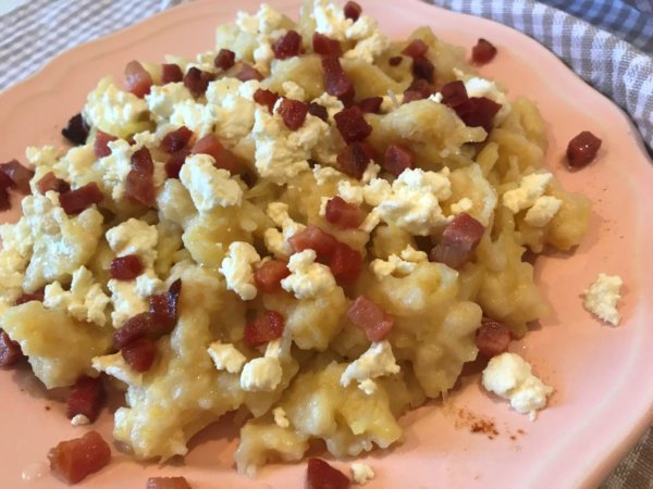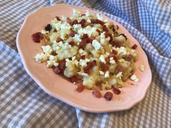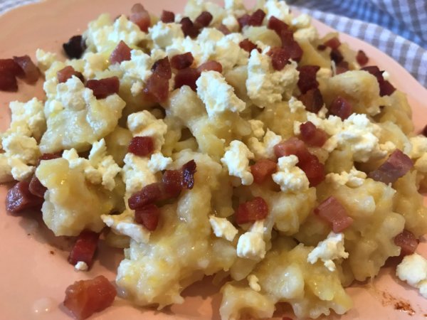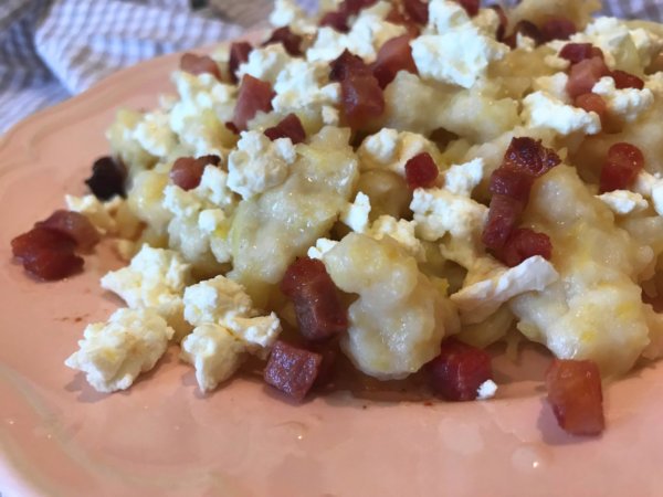 Túrós-tejfölös sztrapacska füstölt szalonna csíkokkal