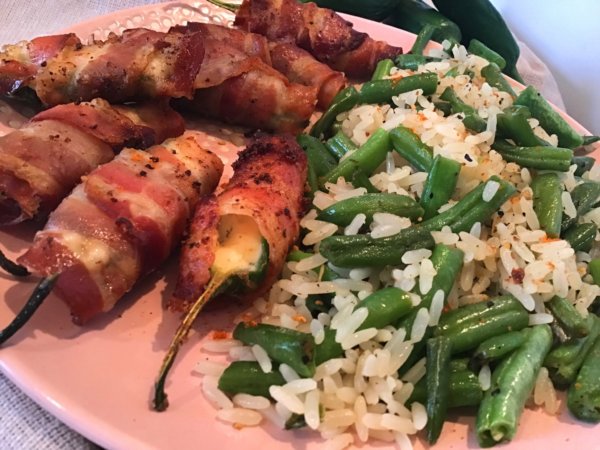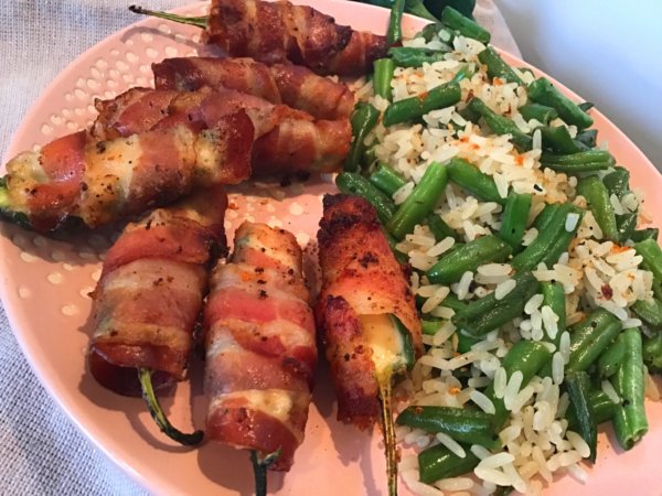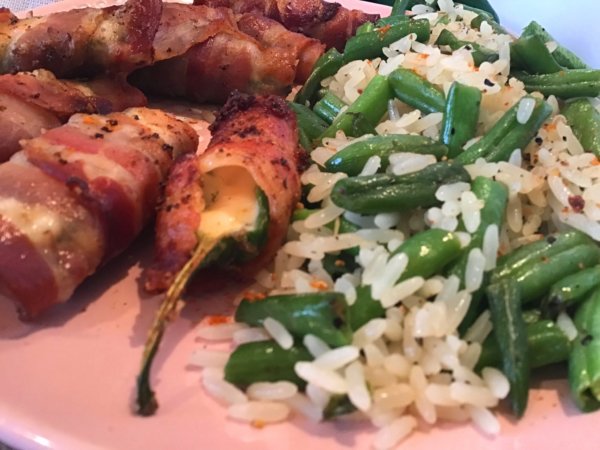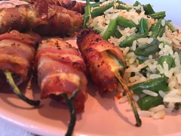 Sajtkrémmel töltött sült baconös jalapeno paprika, zöldbabos rizzsel
