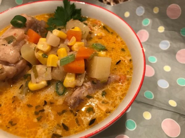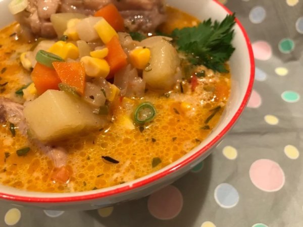Amikor háromnegyed részig megfőtt, tegyük hozzá a szintén kisebb kockára vágott krumplit. Majd főzzük tovább, amikor majdnem készen van, adjuk hozzá a kukoricát.